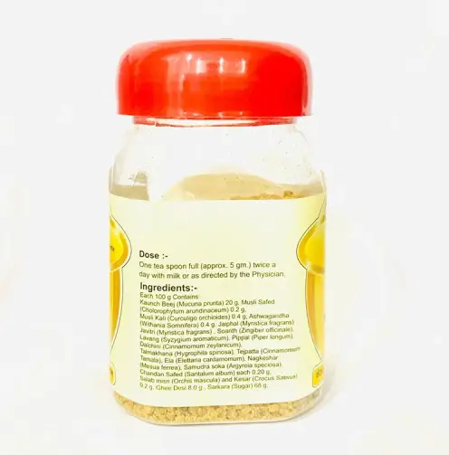 This herbal tonic works as a natural energizer and aphrodisiac, helping reduce weakness, fatigue, and low stamina. It supports muscle strength, improves metabolism, and enhances physical performance. The presence of Desi Ghee and Kesar helps in better absorption and overall nourishment.