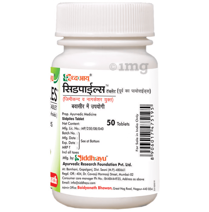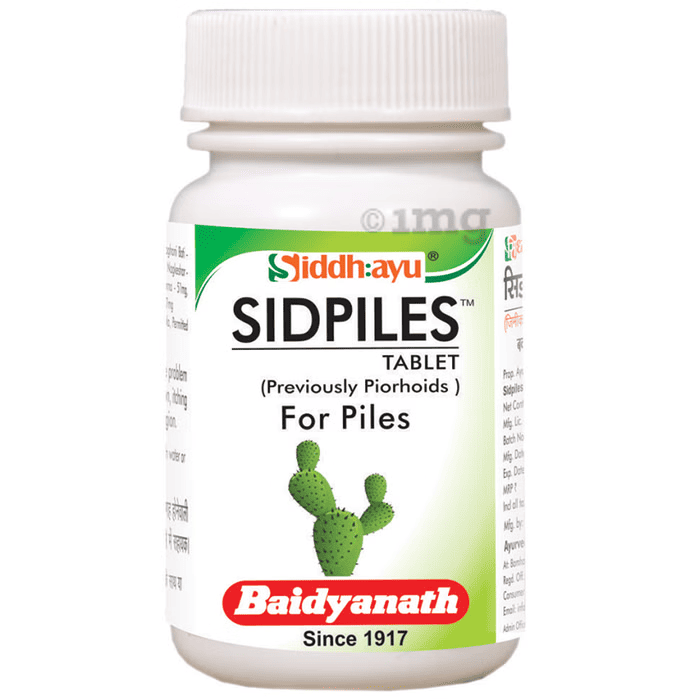Baidyanath (Nagpur) Sidpiles Tablet is a trusted Ayurvedic formulation for the effective management of piles (haemorrhoids). Enriched with powerful natural ingredients, it works as an anti-inflammatory, wound-healing, and soothing agent, providing relief from pain, itching, burning, and discomfort. Its herbal blend also supports smooth bowel movements by acting as a stool softener and helps reduce swelling with its astringent and thrombolytic properties.